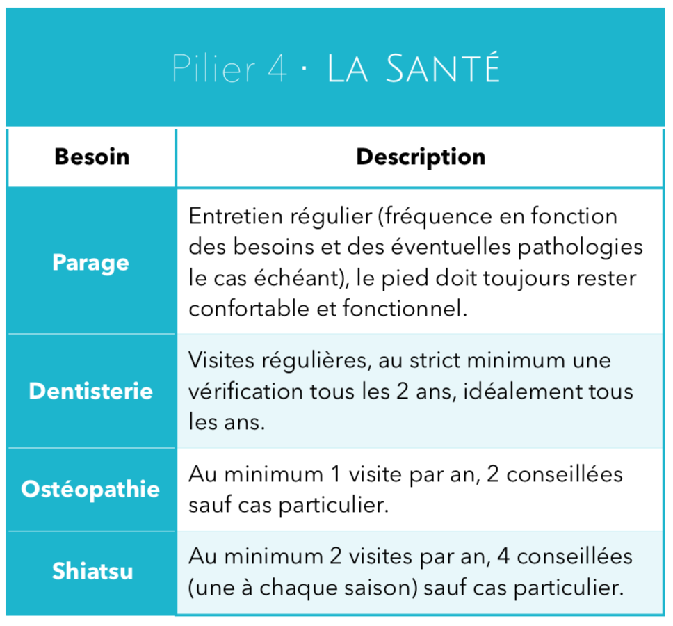 Les prestations de santé (assurées par des professionels extérieurs) relèvent de la responsabilité du ou de la propriétaire de l’équidé le cas échéant ; nous proposons également une formule de pension "intégrale" qui inclut les prestations de santé régulières afin de proposer un service tout compris avec un tarif lissé sur l'année pour les propriétaires qui le désirent.